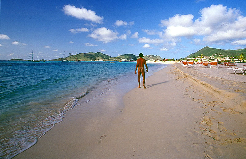 nudist enjoys a long walk down one of the most beautiful tropical nude beaches.