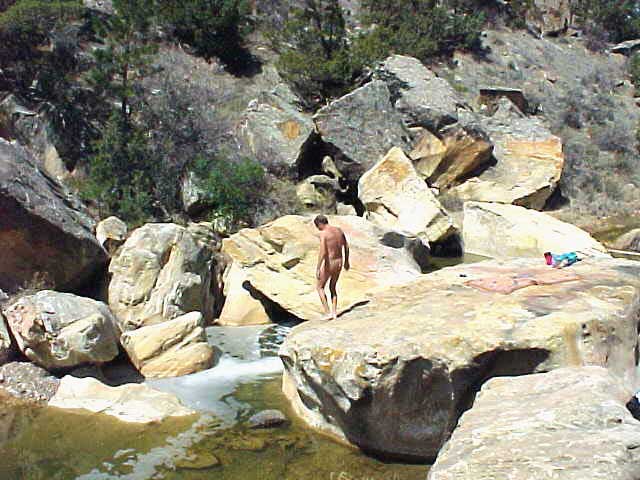 sunbather enjoys a private moment among some giant boulders and a mountain stream.