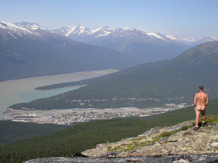 Here are a couple of recent pictures from the Far North, from Murray Lundberg's web page. This is the view from the Upper Dewey Lake Trail above Skagway, Alaska. Both photos are of (self-timer) and by Murray. Breathtaking nudist landscape photography at its best!